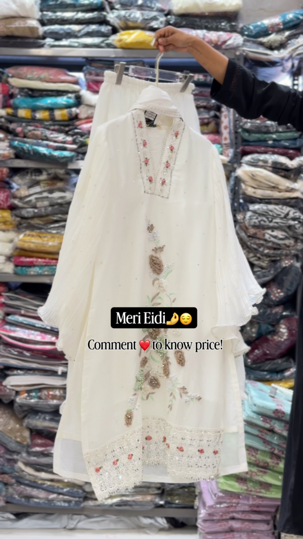 Celebrate this festive season in timeless elegance with our Meri Eidi White Embroidered Festive Suit Set, specially designed for women who love graceful and sophisticated fashion. This beautiful off-white suit features delicate floral embroidery with pearl and sequin detailing that adds a subtle yet luxurious shine. The intricately designed embellished neckline enhances the overall festive look, making it perfect for Eid celebrations, family gatherings, and special occasions.