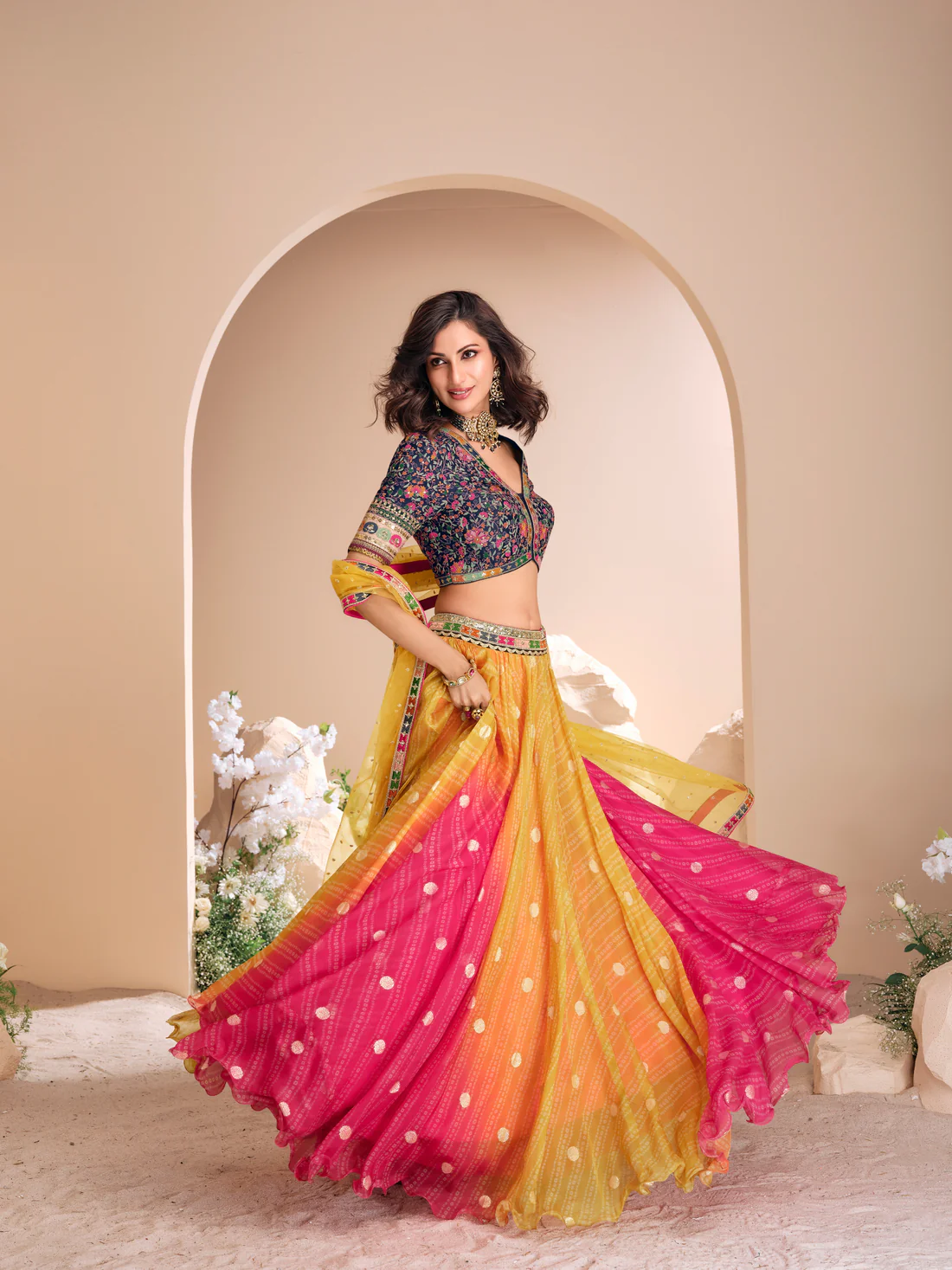 Make a bold fashion statement with this multi-colored ombre embroidered lehenga choli, designed to capture the essence of traditional elegance with a modern touch. The pure viscose jacquard silk fabric with intricate embroidery makes it a must-have for grand celebrations.