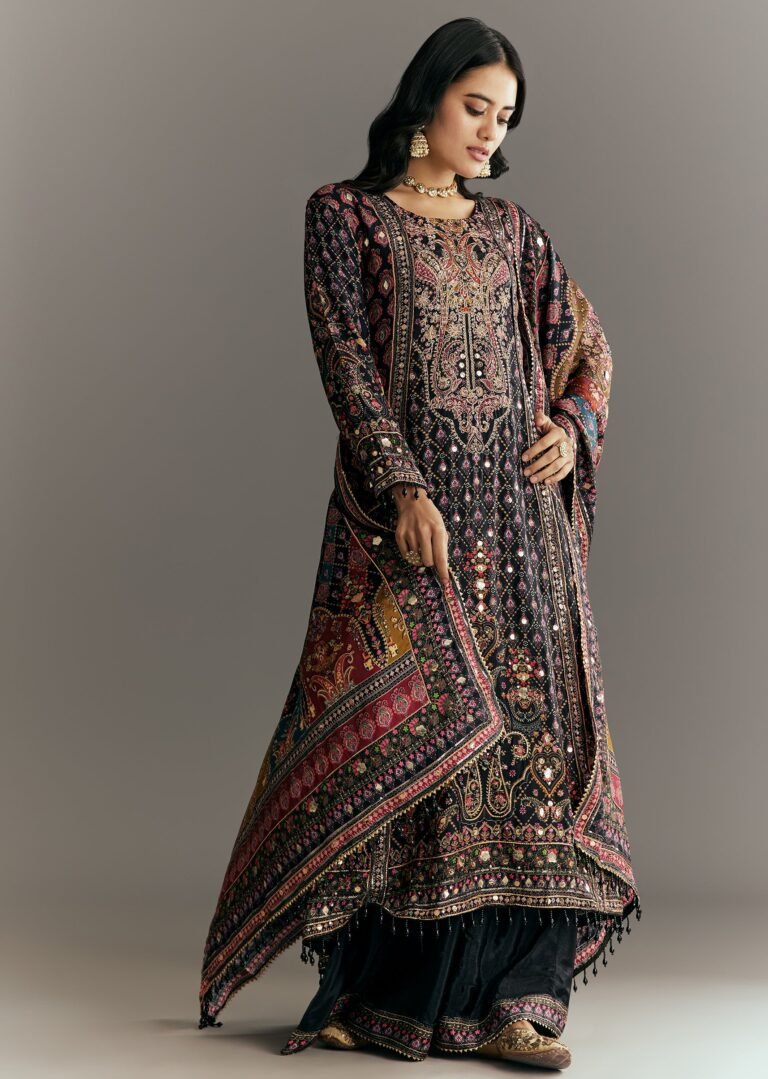 The black kurta is crafted from premium velvet fabric, richly adorned with intricate zari embroidery, mirror work, and multicolor thread detailing in traditional motifs. From paisleys to floral vines, each design element is thoughtfully placed to reflect opulence and artistic mastery. The full sleeves and round neckline add modesty while maintaining a graceful silhouette.