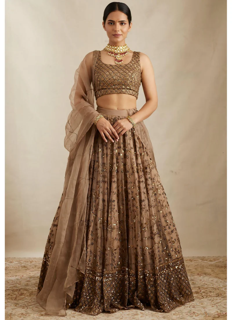 Dress to impress with our stunning brown soft net lehenga embellished with exquisite sequences, zari and embroidery work.