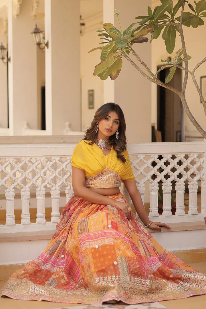 Design & Fabric: Russian silk with rich digital prints and foil embroidery work, perfectly complementing the lehenga.