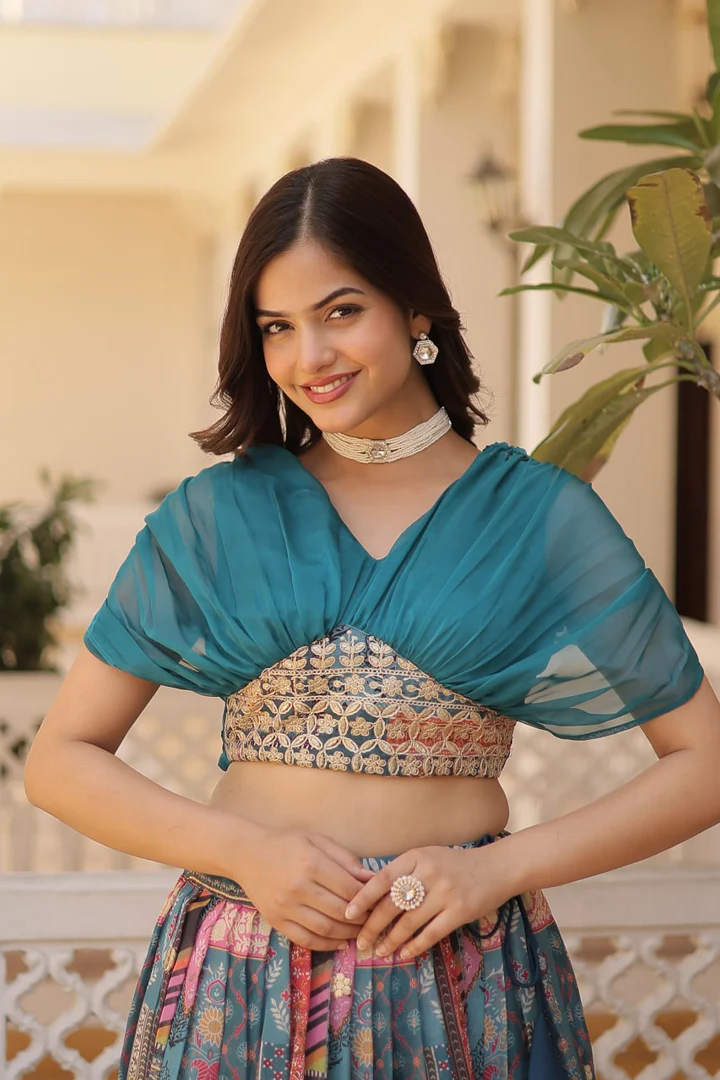 Design & Fabric: Russian silk with rich digital prints and foil embroidery work, perfectly complementing the lehenga.