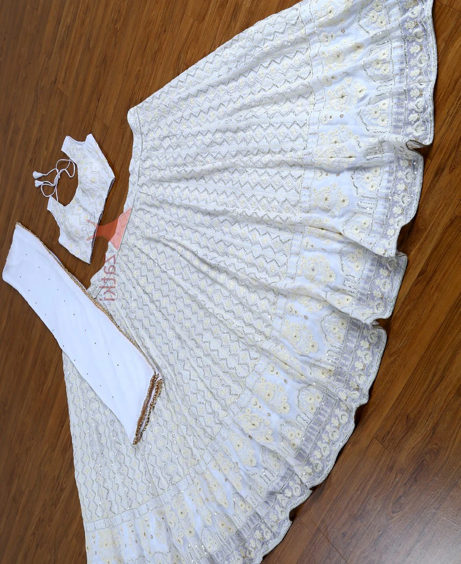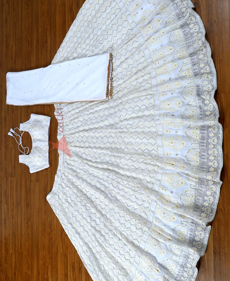 Refresh your look wearing this gorgeous white colored lehenga choli.The georgette lehenga is beautified with embroidery work as shown.The choli is made of georgette blouse with fancy georgette dupatta. Specially designed to wear in weddings, functions, engagements, ceremonies and special occasions. Teaming this lehenga with jewellery and high heels that would be an added attraction. Measurement : Nearly 3.5 to 4 meter lehenga flair, 2.25 meter dupatta, 0.80 meter blouse, lehenga length 42″, waist upto 42″.
