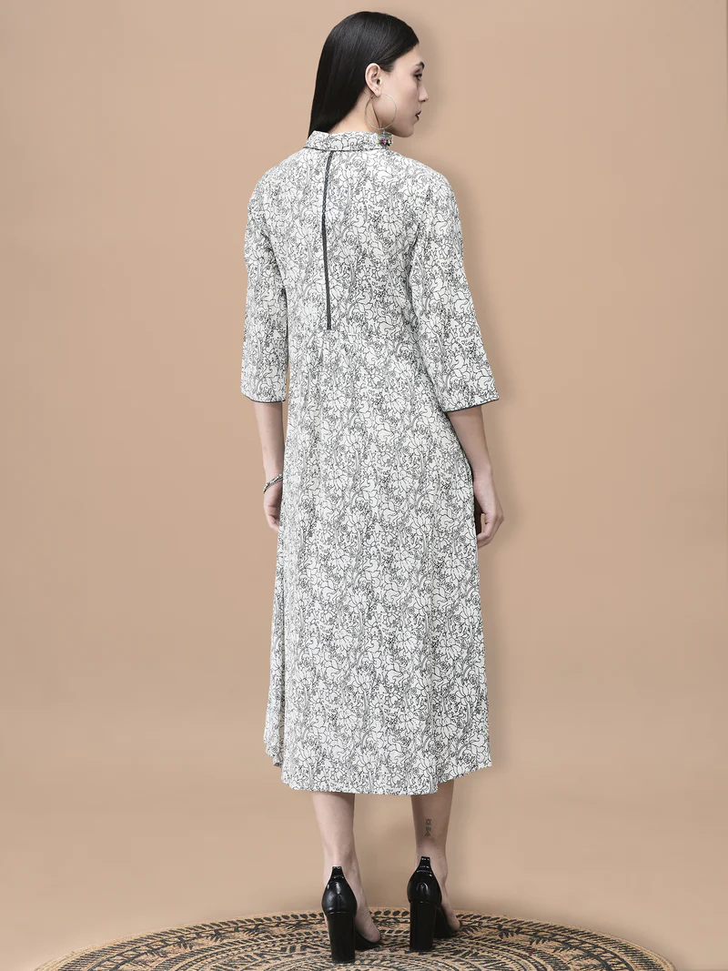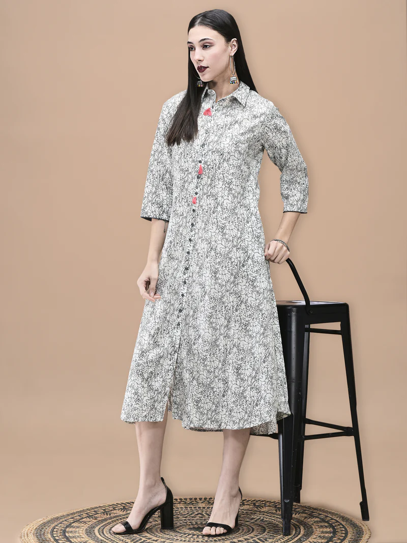 Women Cotton Off White and Blue Floral Print Dress