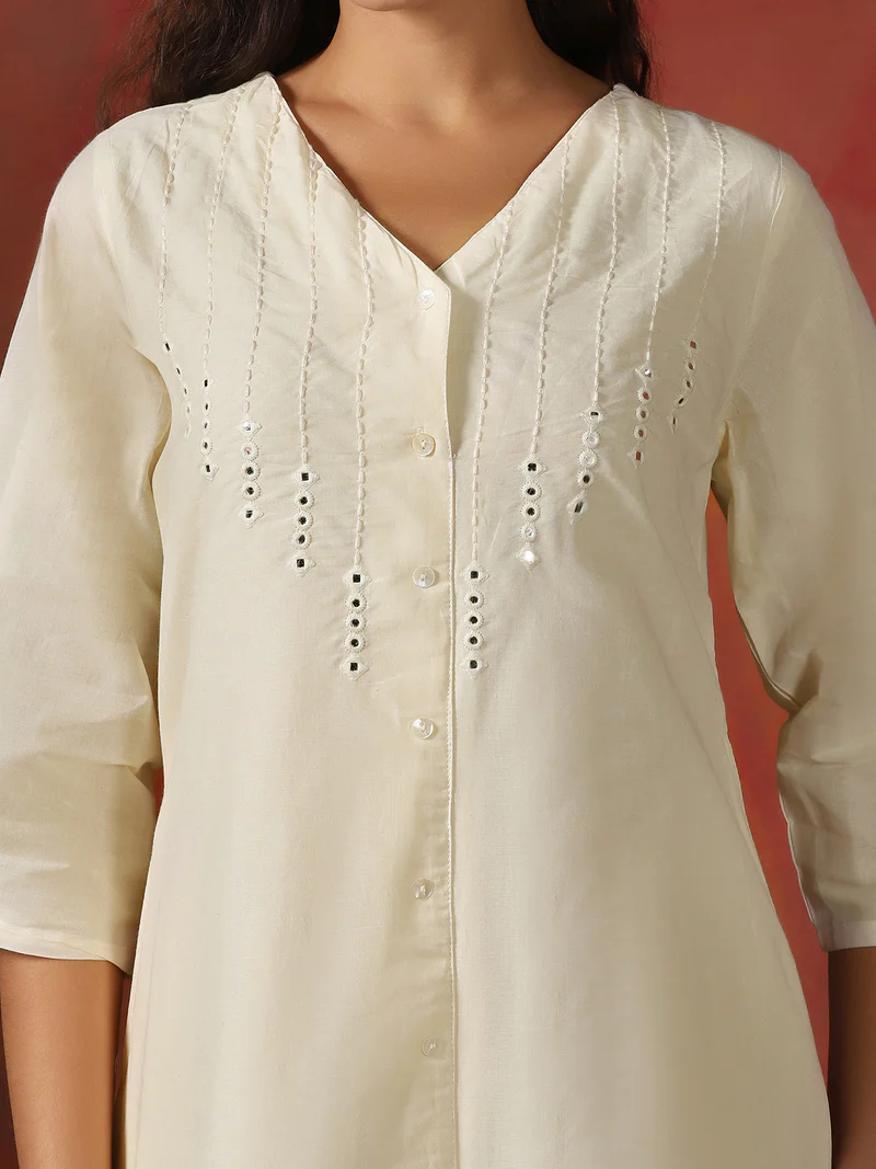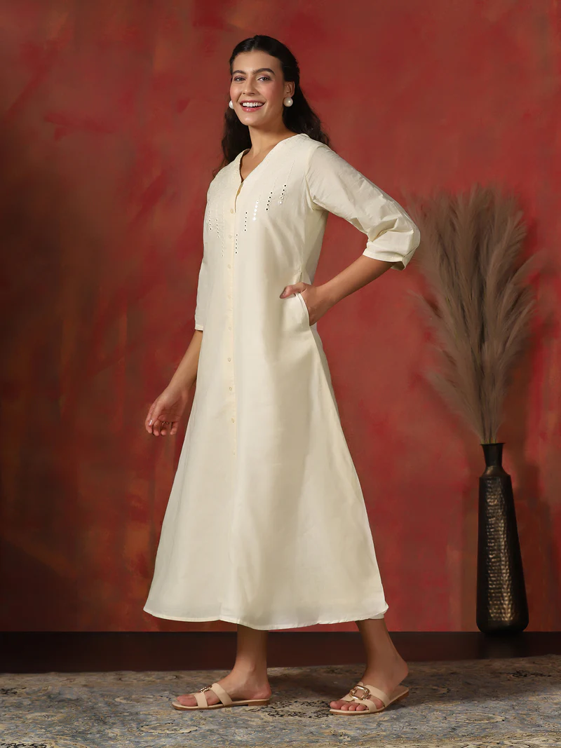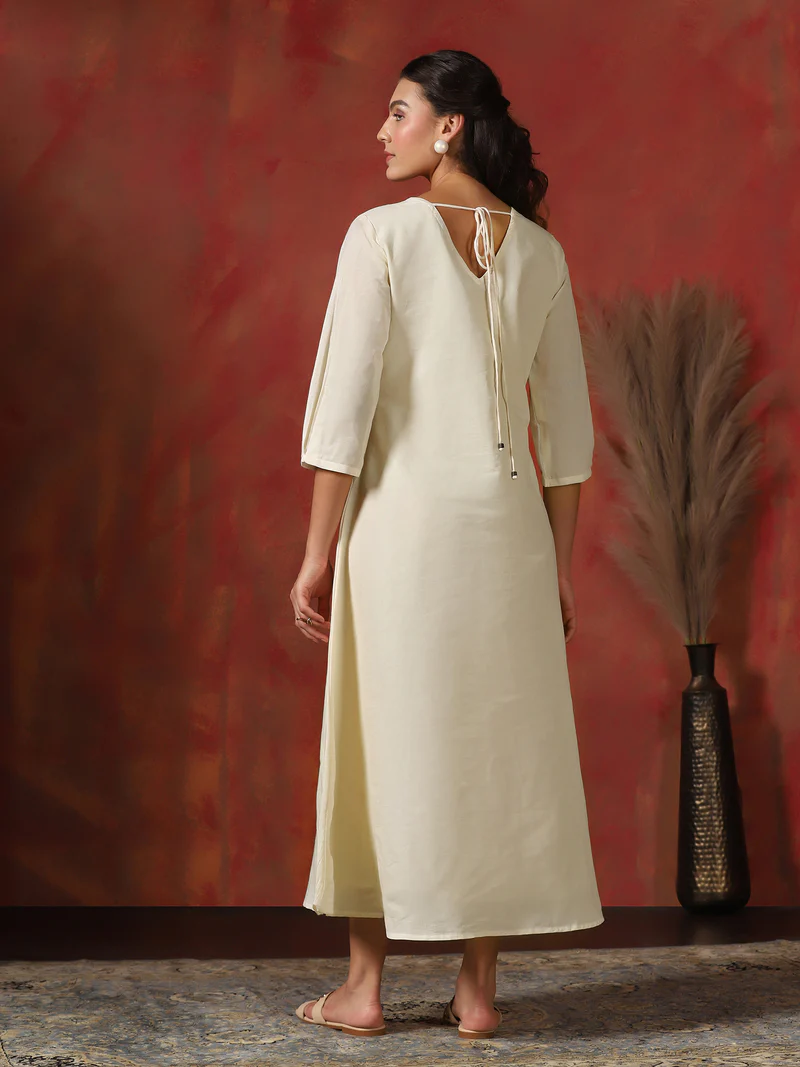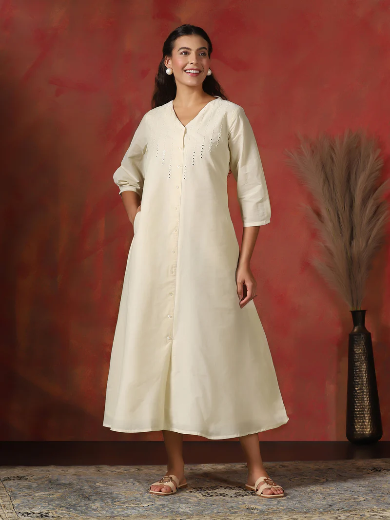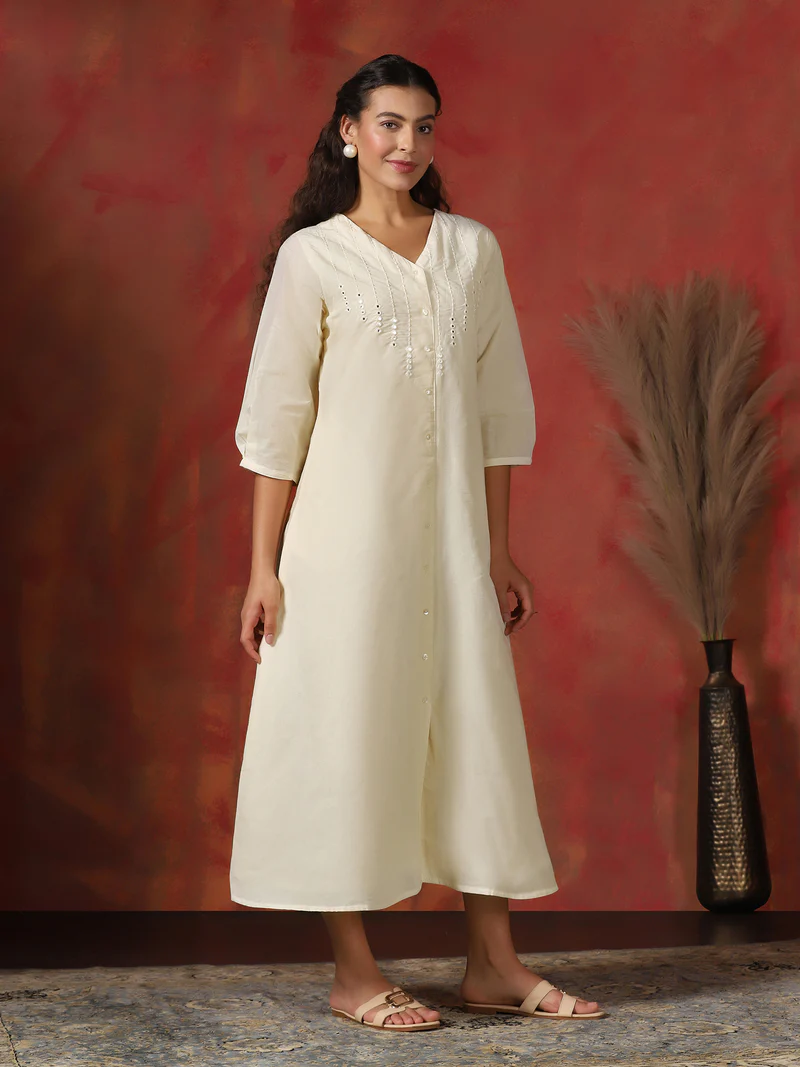 This off-white cotton dress for women combines comfort and elegance through its breathable fabric and delicate embroidery. Ideal for warm weather, the natural cotton material ensures softness against the skin, while the intricate embroidery adds a refined, artisanal touch, making it suitable for both casual and semi-formal occasions. Its light color enhances versatility, allowing easy pairing with accessories for a polished, sophisticated look.